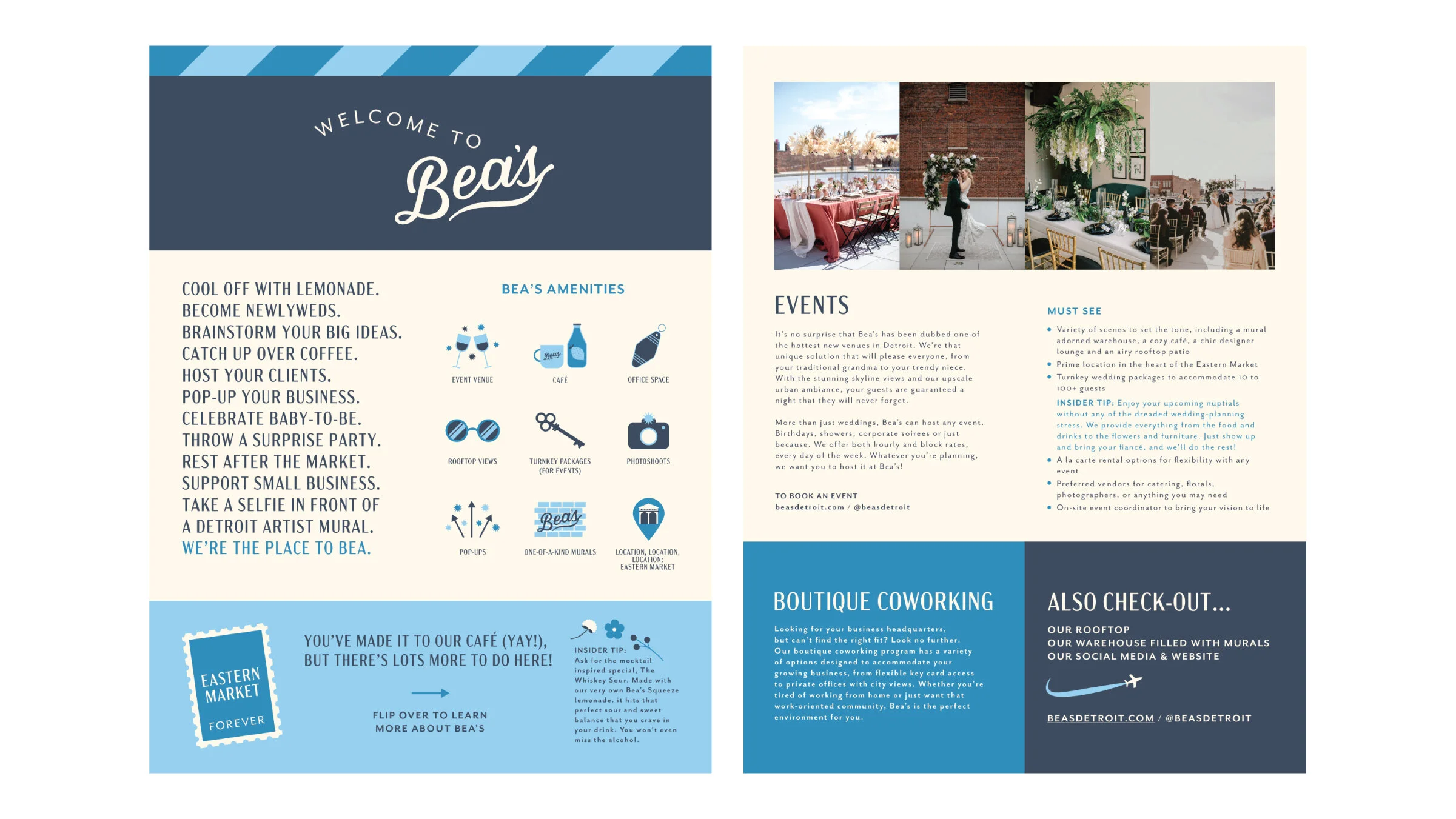 Bea’s Detroit opened in Eastern Market in March 2020, but were quickly forced to pivot their initial business plan due to the pandemic. Owners Bea and Eli Wolnerman adapted to “the new world” and shifted the building’s use to include a tiny wedding program. Bea’s Detroit soon became a premier wedding venue in the city, while still functioning as a boutique co-working space and a charming café. Their team needed to update their initial Bea’s brand in order to reflect the changes, but to also communicate the versatility of the space quickly to customers, without confusing them.